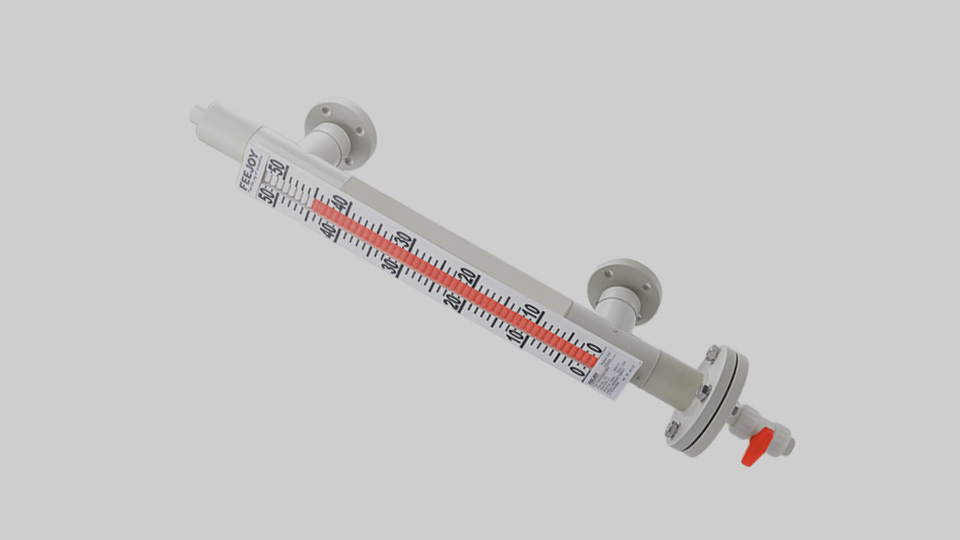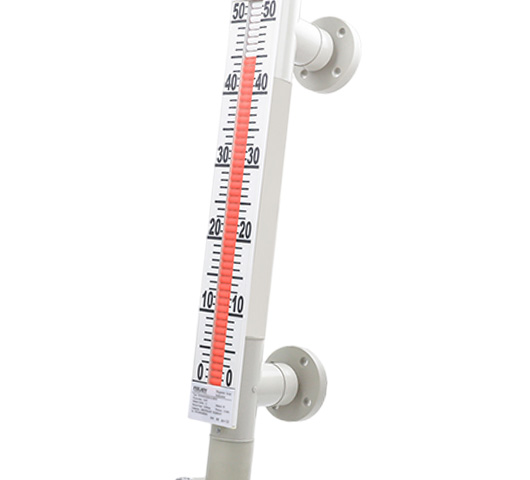 液位計根據浮力原理,浮子在測量管內隨液位的升降而上下移動,浮子內的永久磁鋼通過磁合作用,驅動紅、白色翻柱翻轉180液位上升時,翻柱由白色轉為紅色,下降時,翻柱由紅色轉為白色,從而實現液位的指示。